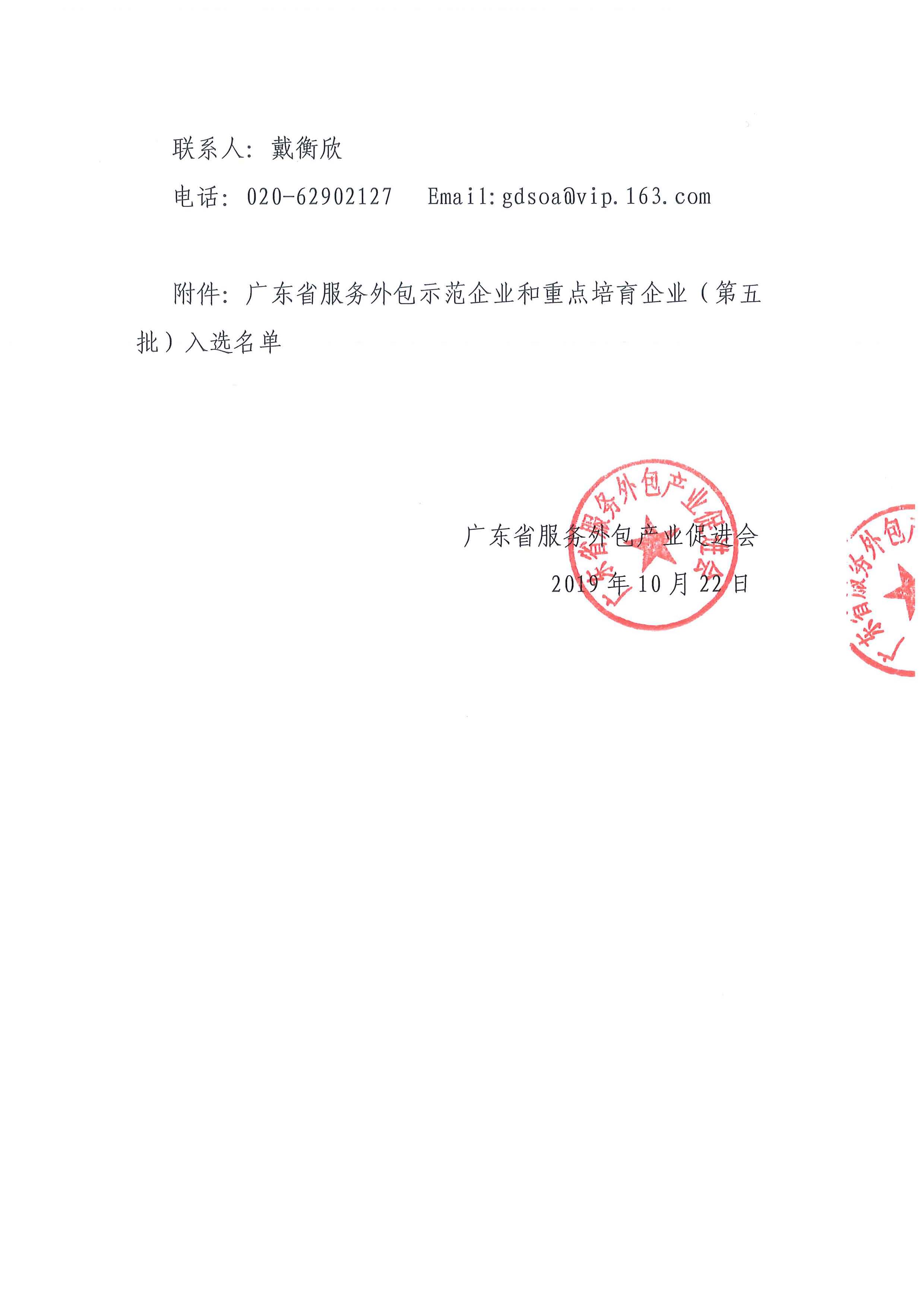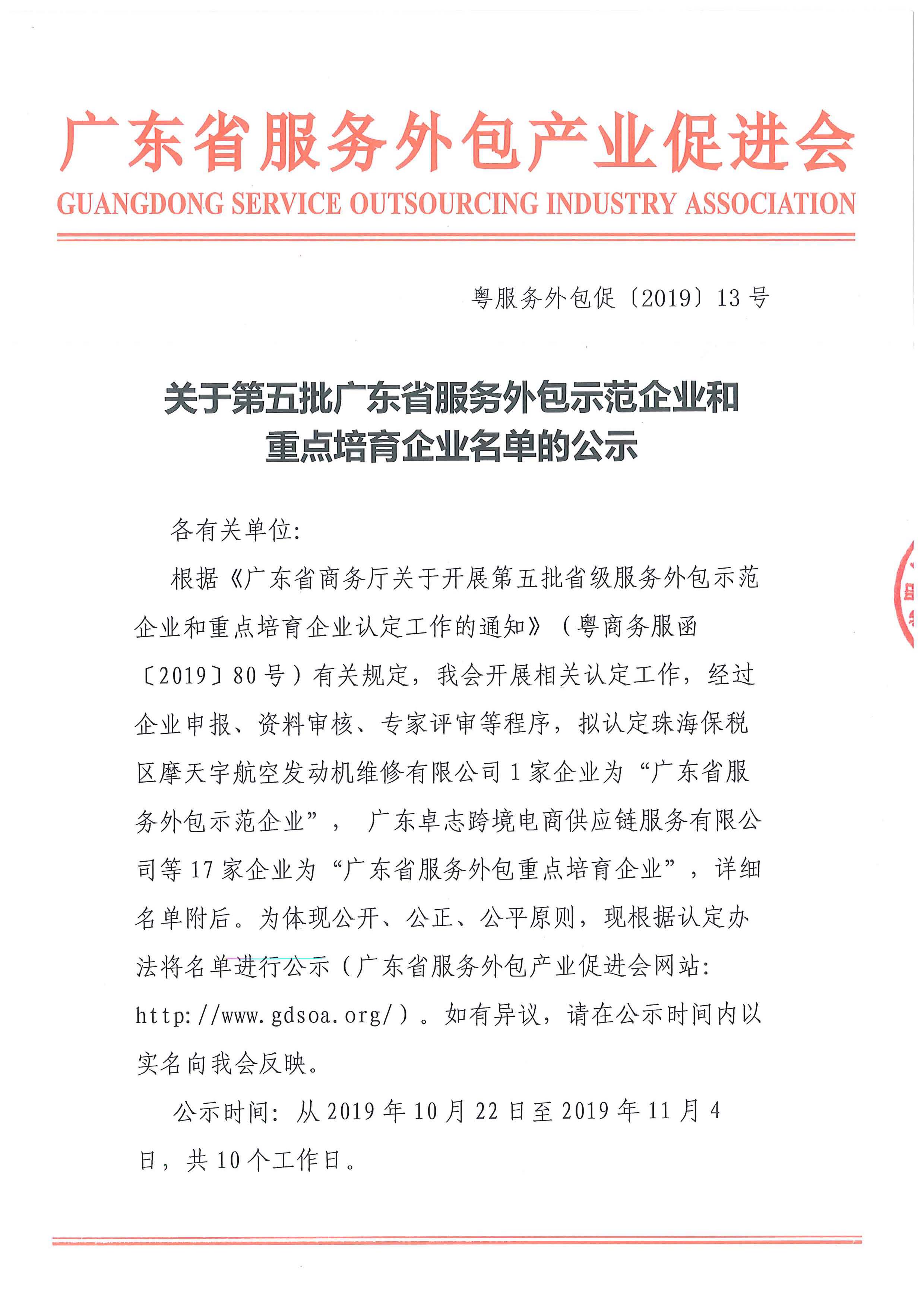 转发 关于第五批广东省服务外包示范企业和重点培育企业名单的公示