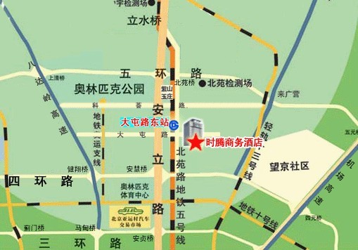 乘公交:北京西站出发,北京西站坐387路,经过16站,到达秀园站,倒任意到北苑路大屯站的车,步行约50米到达北京时腾商务酒店。